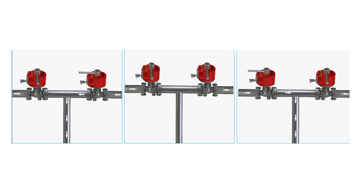 通過(guò)一個(gè)簡(jiǎn)單的閥門(mén)聯(lián)鎖系統(tǒng)說(shuō)明從一種介質(zhì)(右管)轉(zhuǎn)換到另一種介質(zhì)(左管),避免兩種介質(zhì)的互相混合